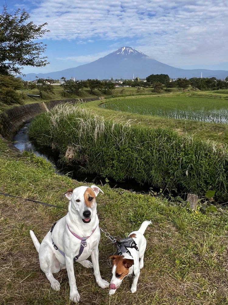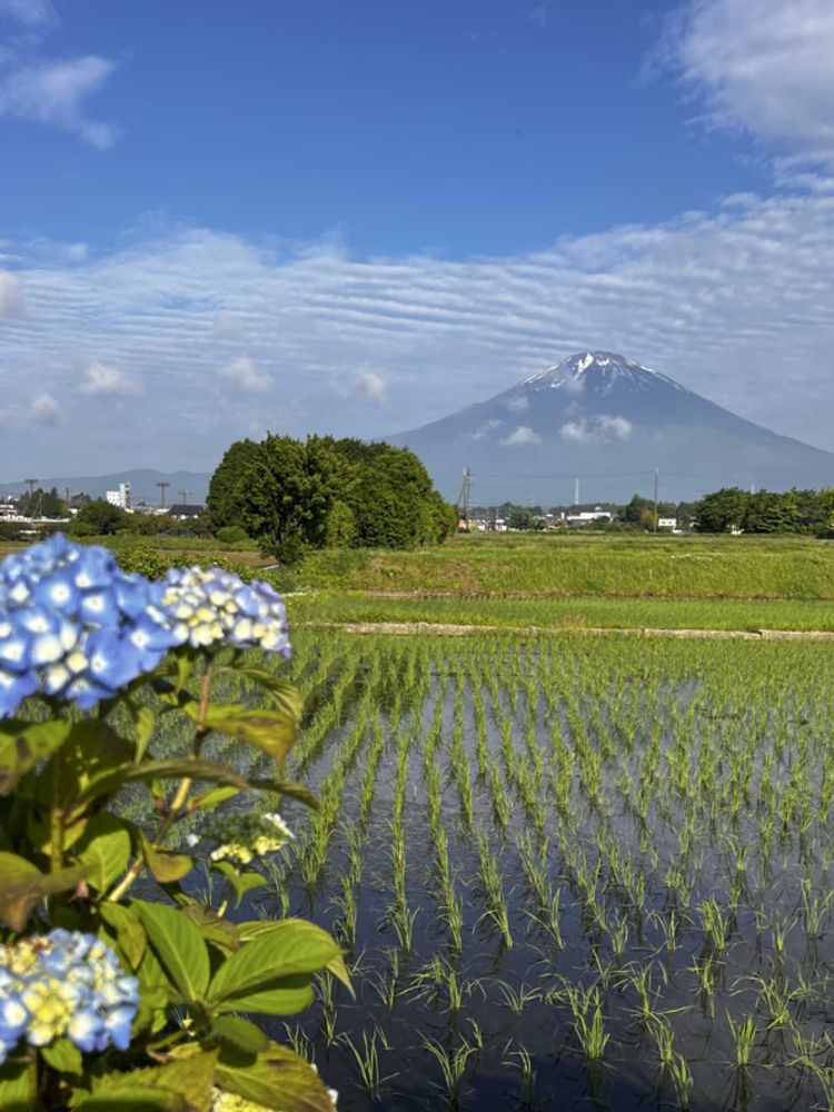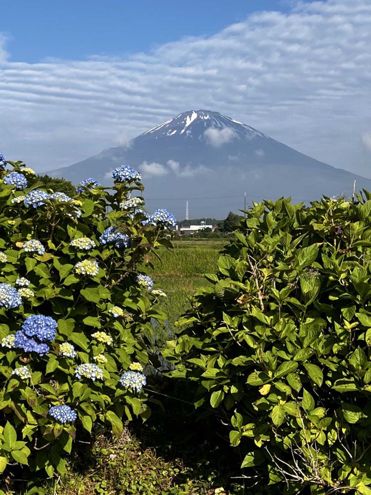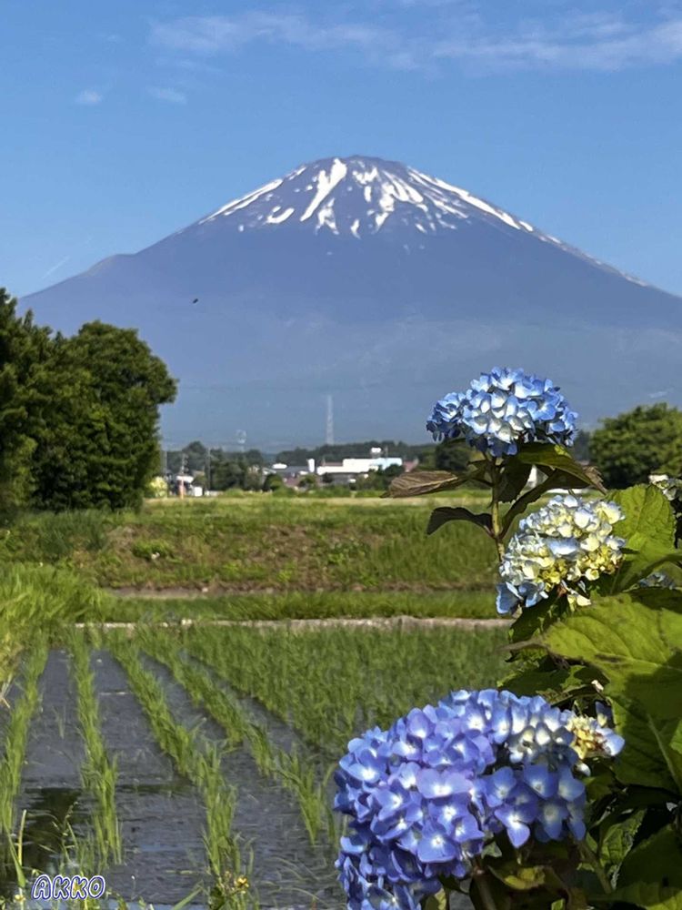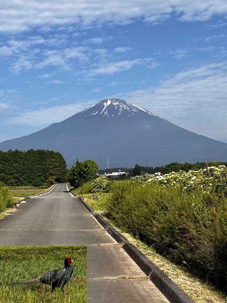 今朝の富士山と紫陽花、田んぼ、雉、散歩犬