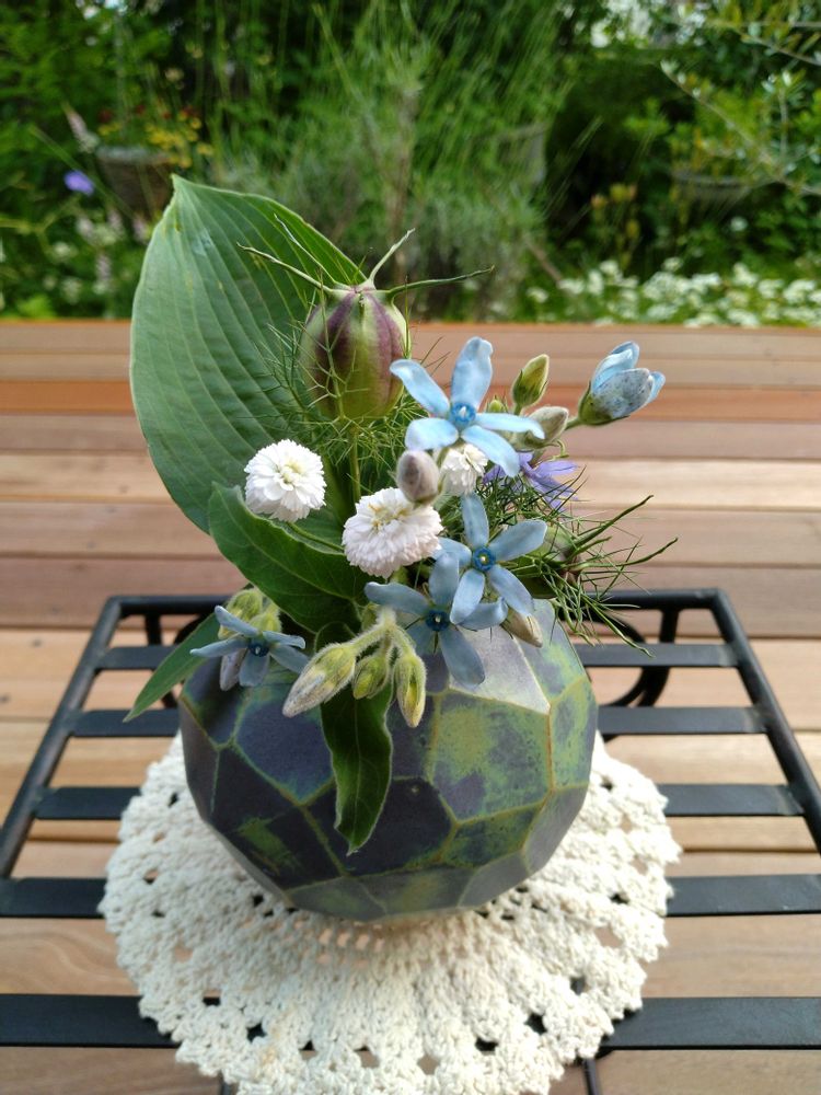 ニゲラの実が植物と花器の色や形を繋ぐ役割を果たしていて、ブルースターが主役で視線が上手く誘導されますねー👏👏👏