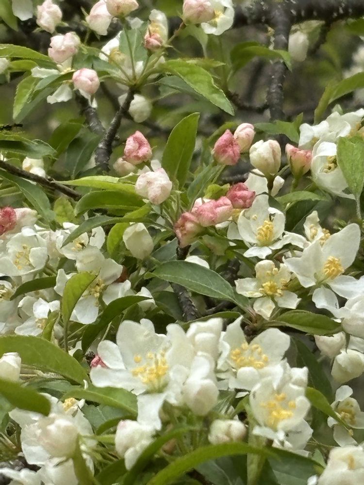 こんなに沢山のズミの木を見たのは初めてです。先日紅色の蕾を見かけましたが、今回はピンクから白に色変していく様子を楽しみました