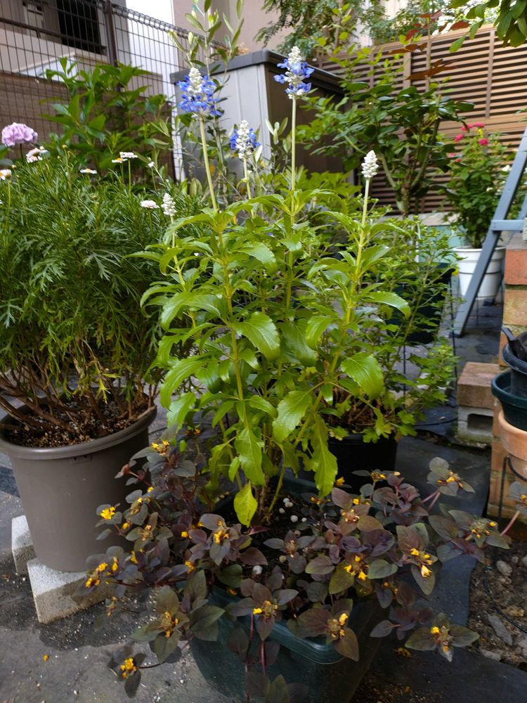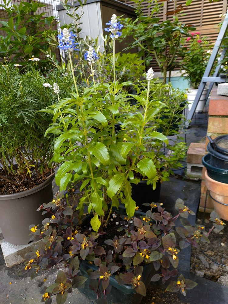 寄せ植えを解体した時に、リシマキア・ペルシャンチョコレートを残し、ブルーサルビアを植えてました😊
