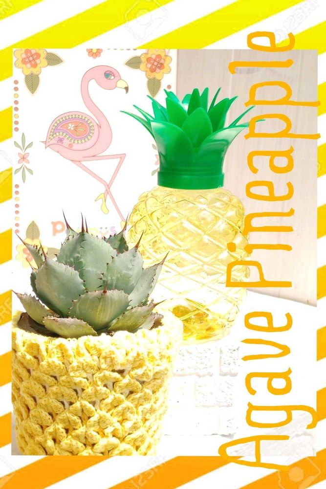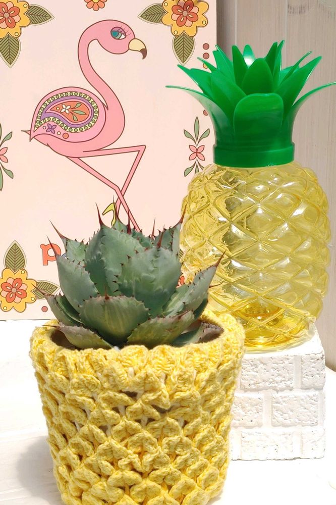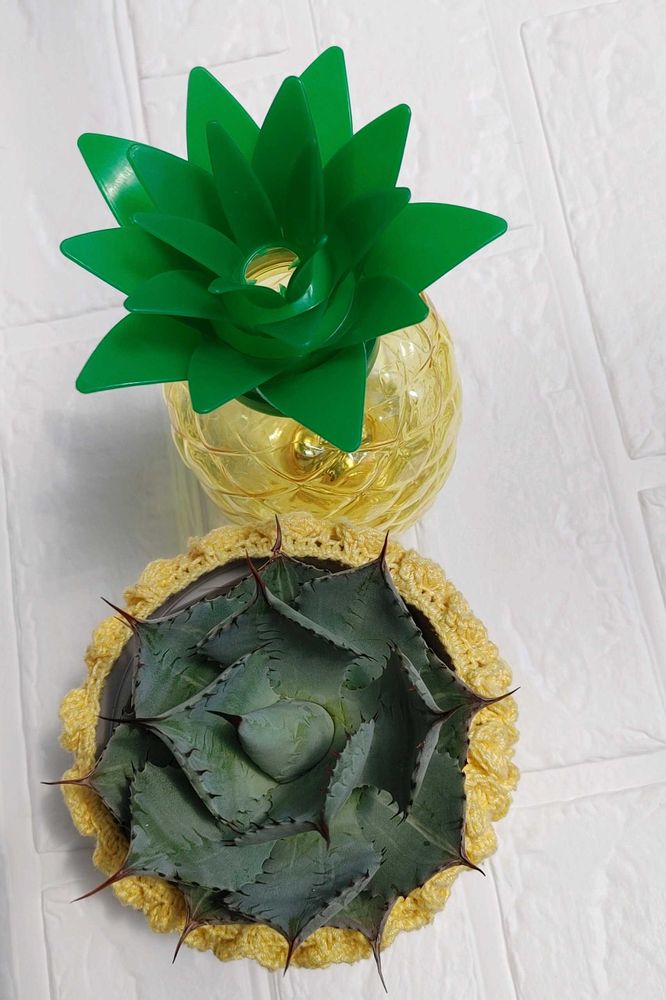 アガベがパイナップル🍍に見えたので、プランターカバーをパイナップルに見えるように編んでみました!