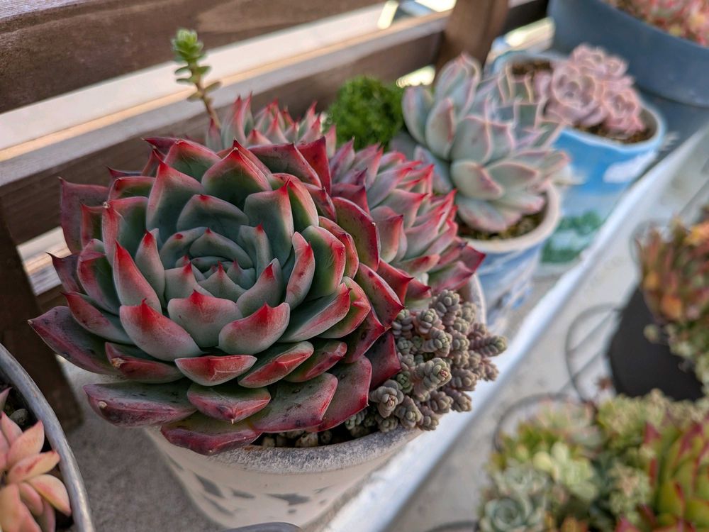 手前の多肉さん、今の時期に、こんなに綺麗な色なんて、素敵過ぎるね😍どちら様かな?