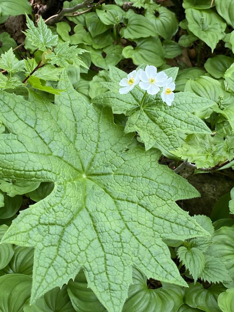 サンカヨウは大小2つの葉(かなりデカい❗️)の小さい葉の方に花が付きます❣️