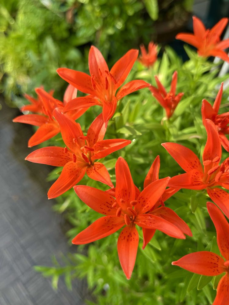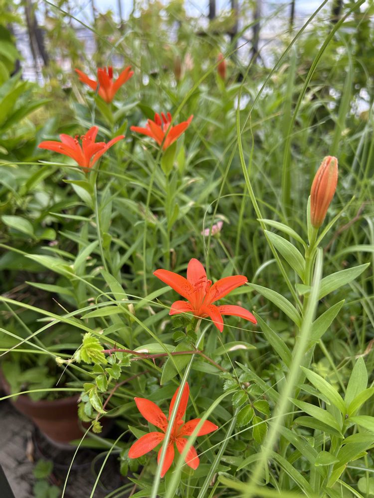 小庭のヒメユリ。濃い蛍光オレンジ🧡のくっきりとした小ぶりの花は上向きに開きます。