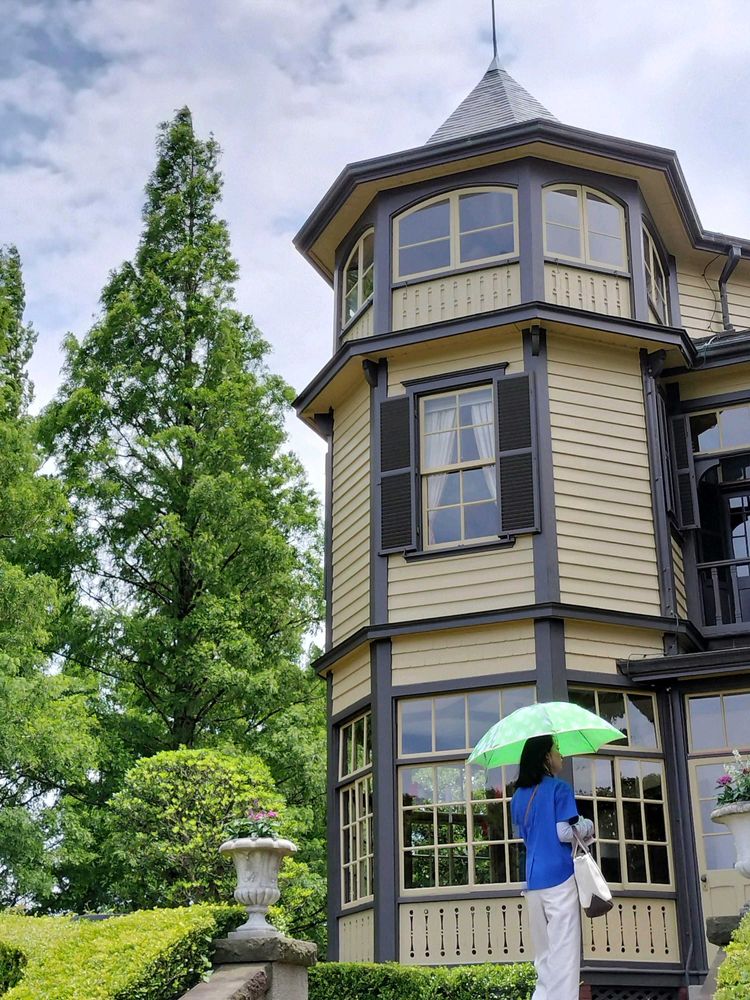 鮮やかなブルーのウェアにグリーンの傘のお姉さまが外交官の館に