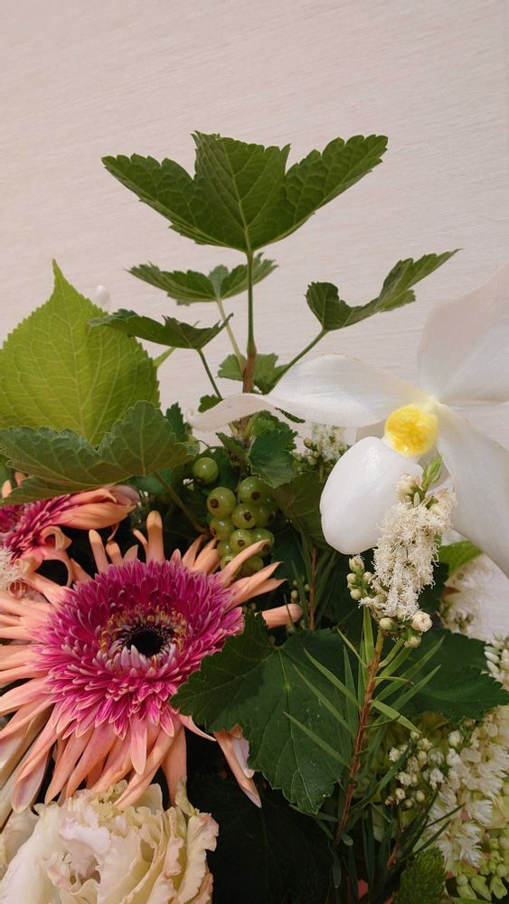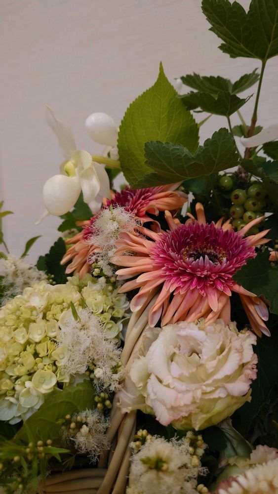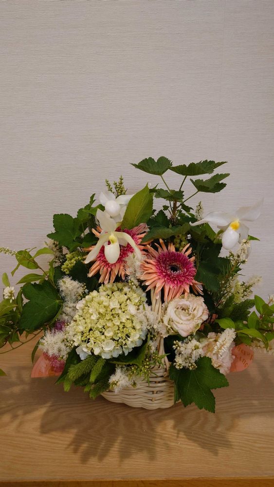 今週は大輪のガーベラとアジサイが印象的なアレンジです。