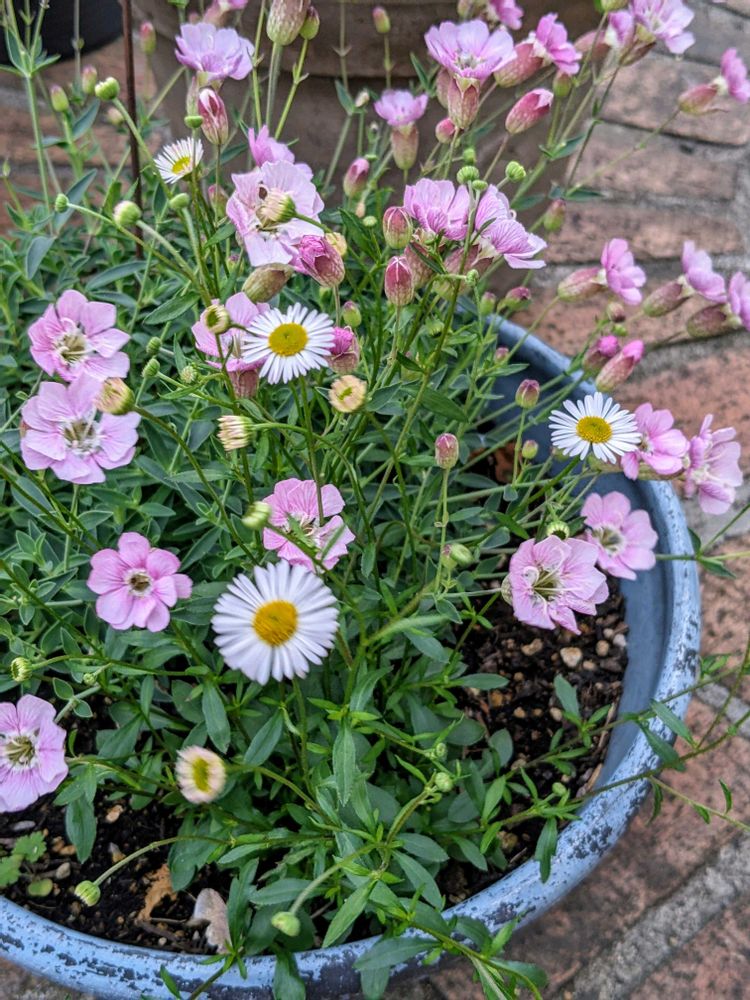シレネユニフローラは垂れ下がるイメージだったけど、しっかり上に咲いてエリゲロンと混ざってます😄✨
