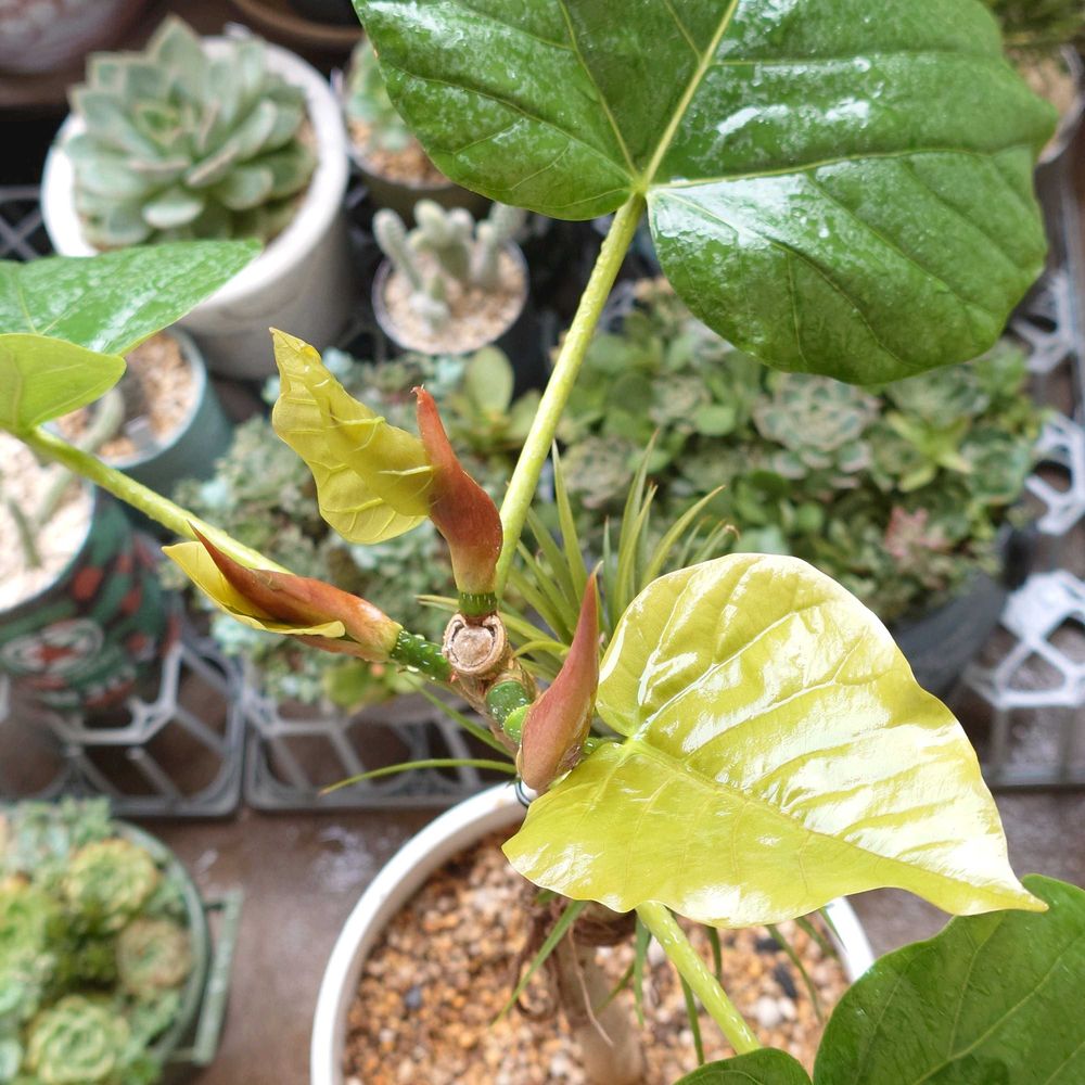 2025.8月に某サイトで購入した【アロカシア チャイ】の 突然変異?なんだろう 購入時、元々有った葉を(1枚目の葉)として、 下から新たな葉が出てきてる状態で到着しました(2枚目の葉) こちらに来て初めて出てきた葉に異変が。。 育て始めて出てきた初めての3枚目、4枚目 (途中から、斑1、斑2、、と続きます) どこまでこの謎の斑入葉が続くのか、 いや止まるのか……記録していきます