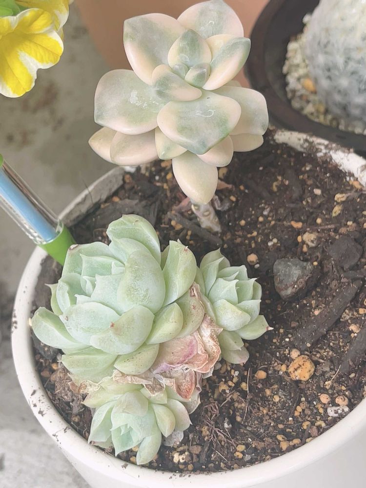 だんだん小世帯になりました♡一旦日陰に置いて夏越しの準備中です。水やりチェッカーで水切れを確認しつつ、活力剤でユッカの短い方を様子見しています。ソーラーライトをもう一つ購入するべきか悩んでいます♡