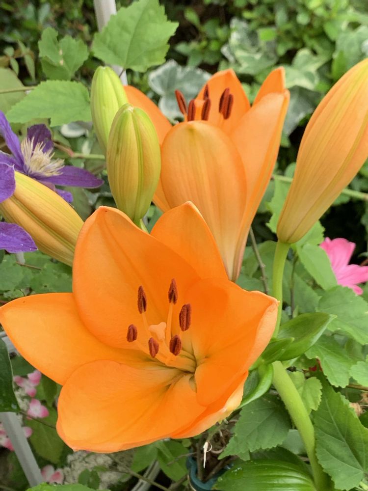きょうのお花🧡庭のゆりちゃん、咲きました🧡全開より、開きかけの時が好きです🧡周りのお花さん達もゆりちゃんが咲いて嬉しそうです🧡