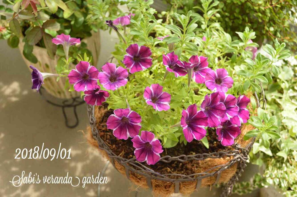 吊り鉢で楽しんでいるペチュニアのミスマーベラスが突然満開になりました(^^)