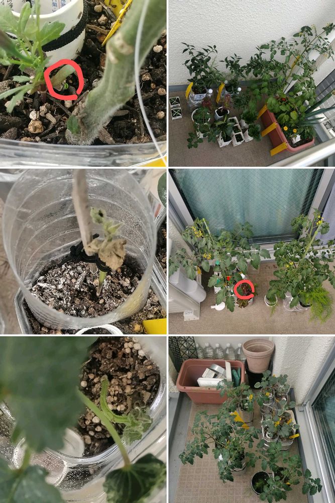 左上:東ベランダ左のミニトマト鉢にバジル発芽。