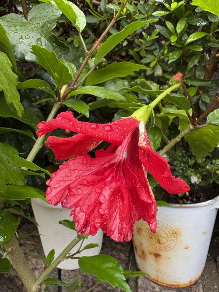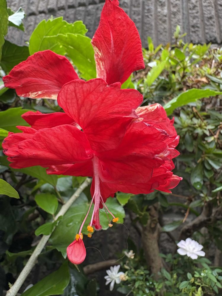 春に外に出して初めて咲いたハイビスカスレッドフラミンゴ🌺