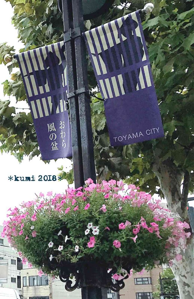 富山駅周辺の街中ではこんなフラッグとお花で