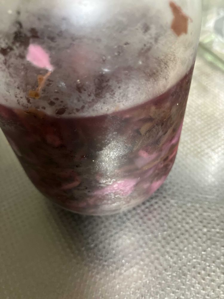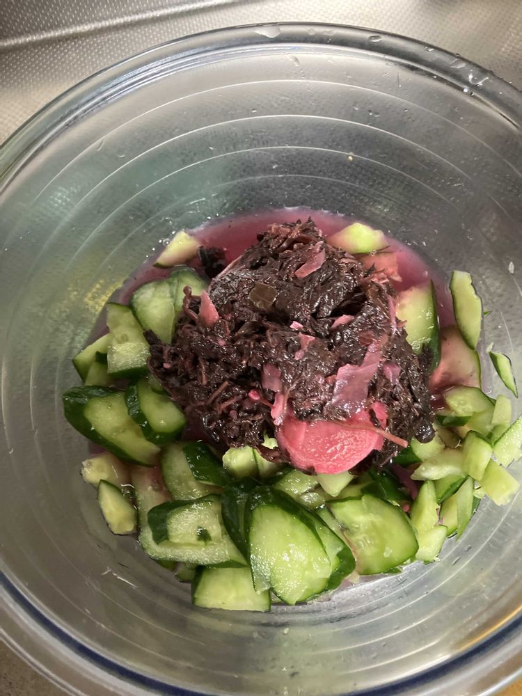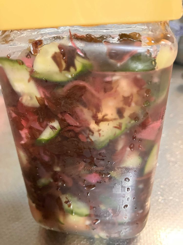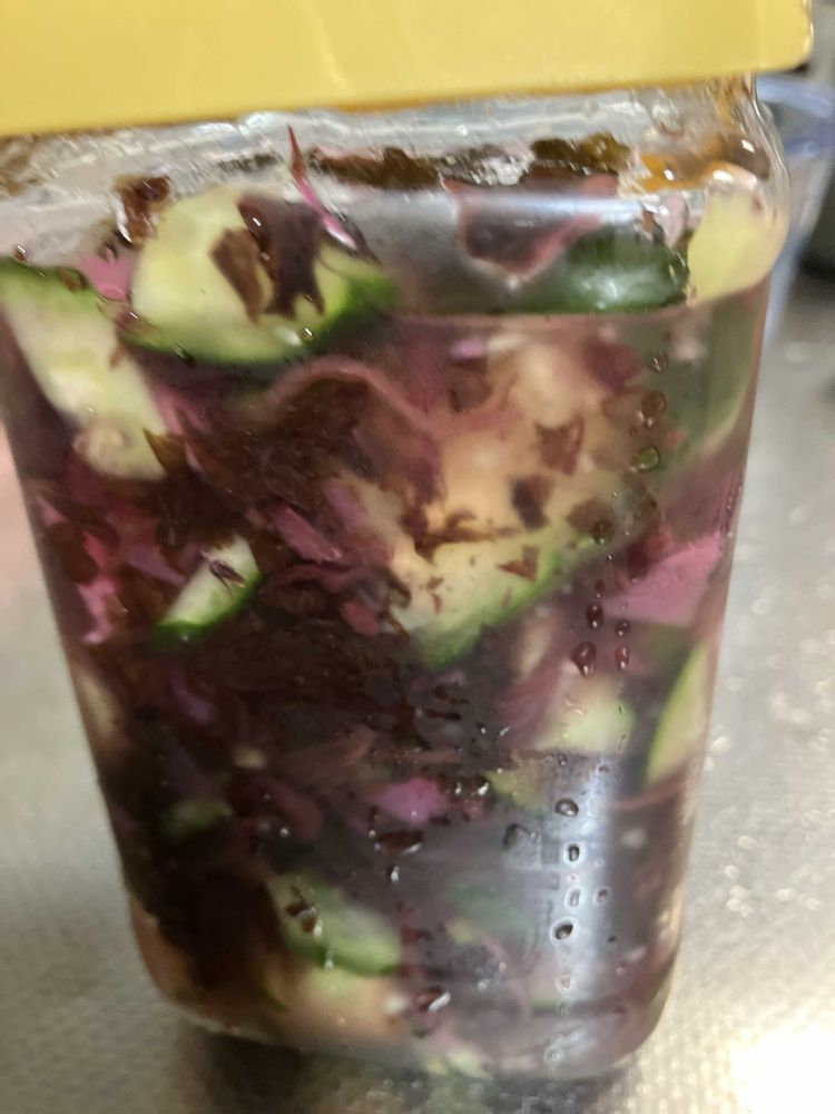 昨年の 紅しょうがの赤紫蘇の中に きゅうりを3〜5ミリに切って 塩もみしたものを入れました