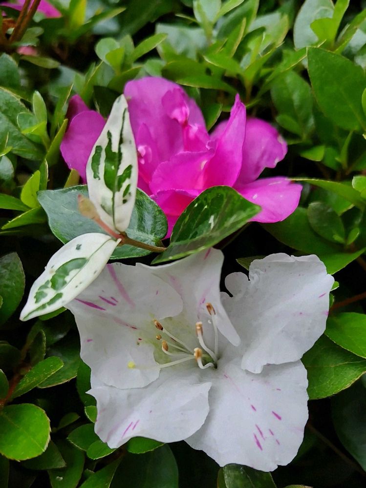 皐月の間からひょっこり顔を出した初雪葛の葉が美しかったので撮りましたが、皐月の方が目立ってますね🍀
