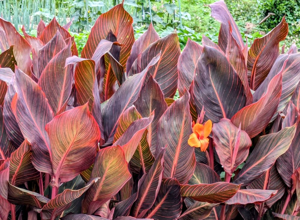 散歩道で見かけたシックな赤褐色の葉に囲まれて一輪だけ咲いていたカンナ🧡でしょうか🤔とても綺麗でした✨