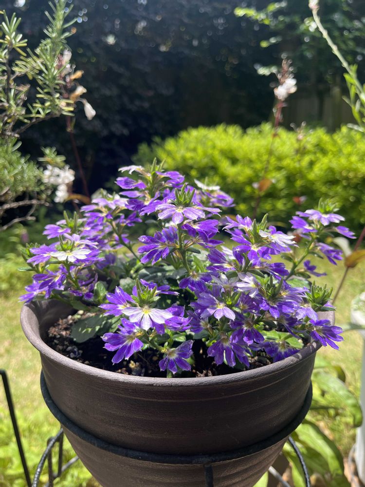 サンクエールブルーグラデーションこぶし大の株から花が広がり始めました♪鉢が隠れるくらいにこんもりするのが楽しみです