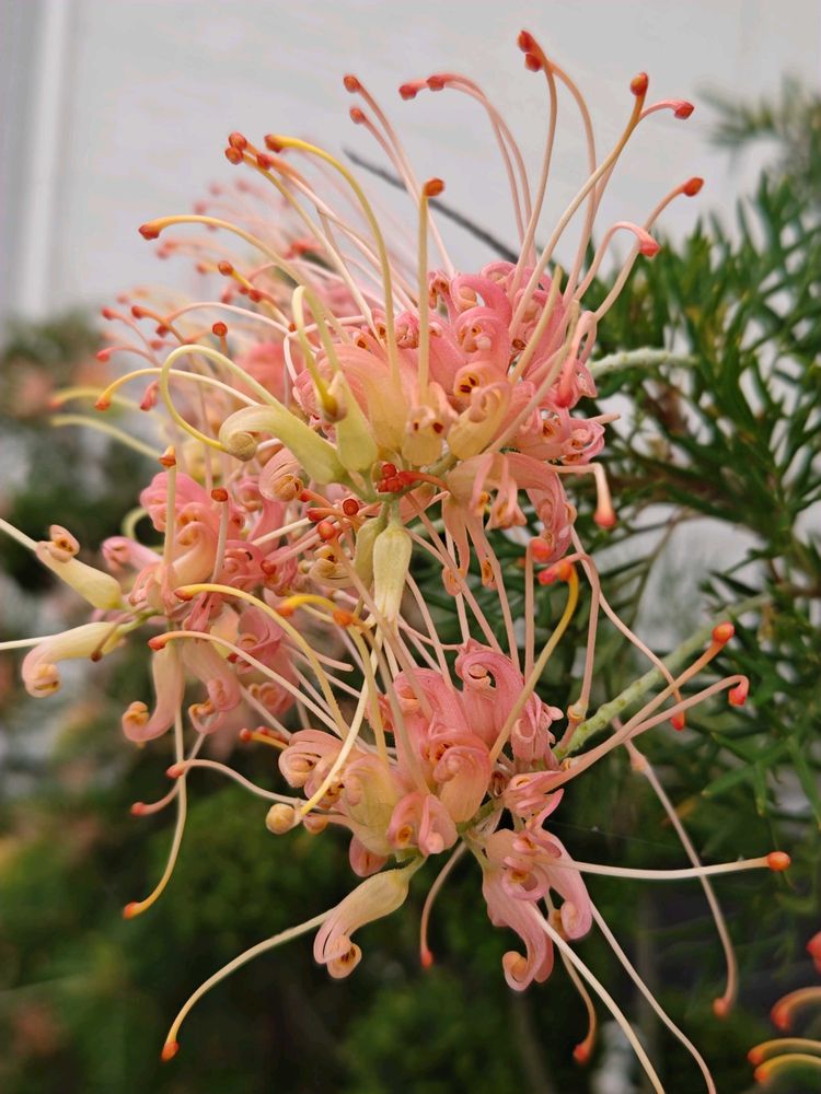 去年新しくできたマンションの植栽。グレビレアが花火のように咲いてます。