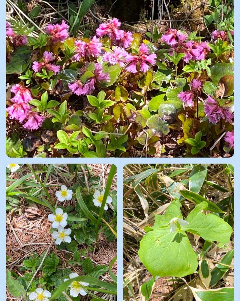 たくさんの高山植物、イワカガミ、ショウジョウバカマ、フデリンドウ、シロバナエンレイソウなど