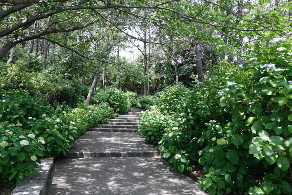 小さな丘には約2万株の様々な色のアジサイが咲きます。
