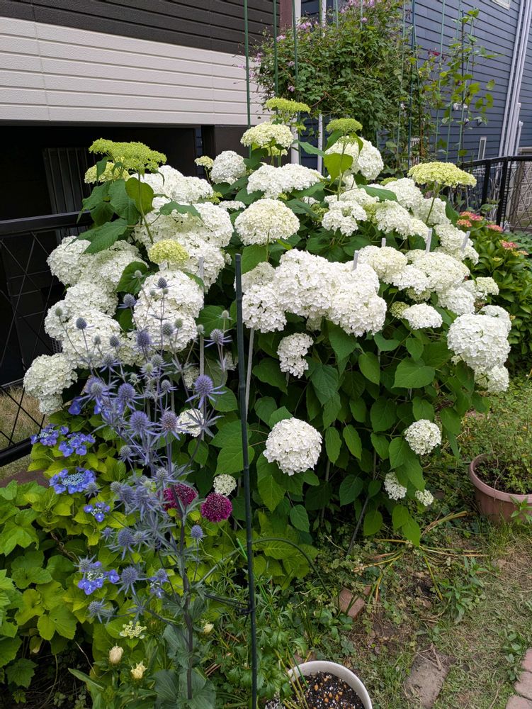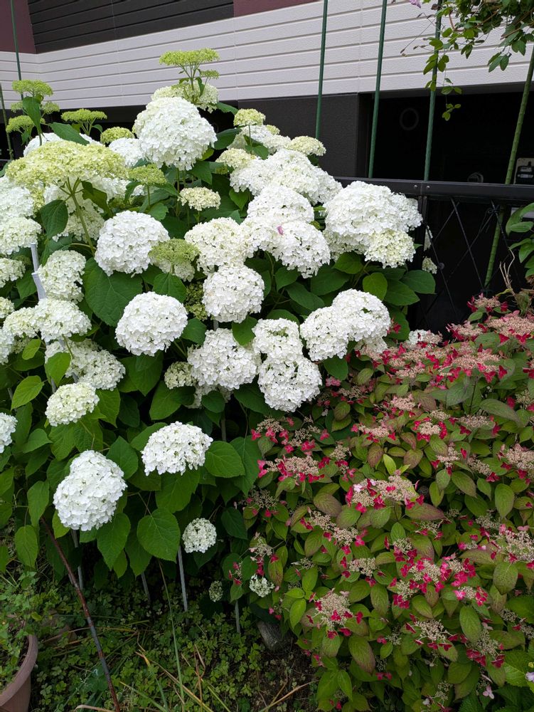 アナベルとほかのコラボ。ピンクは、伯母の家から、もらってきた枝を挿し木して大きくなりました。