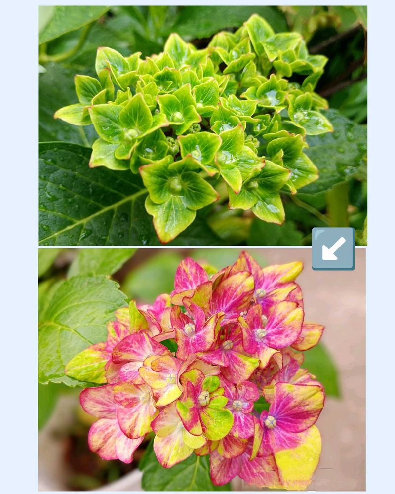 ✤🍀花友さんから頂いた🌱この紫陽花。グリーン💚から❤️へと色変わりする ハイドランジア、シュロス(詳しい名前🤔?。日々の色変わりが楽しみです。