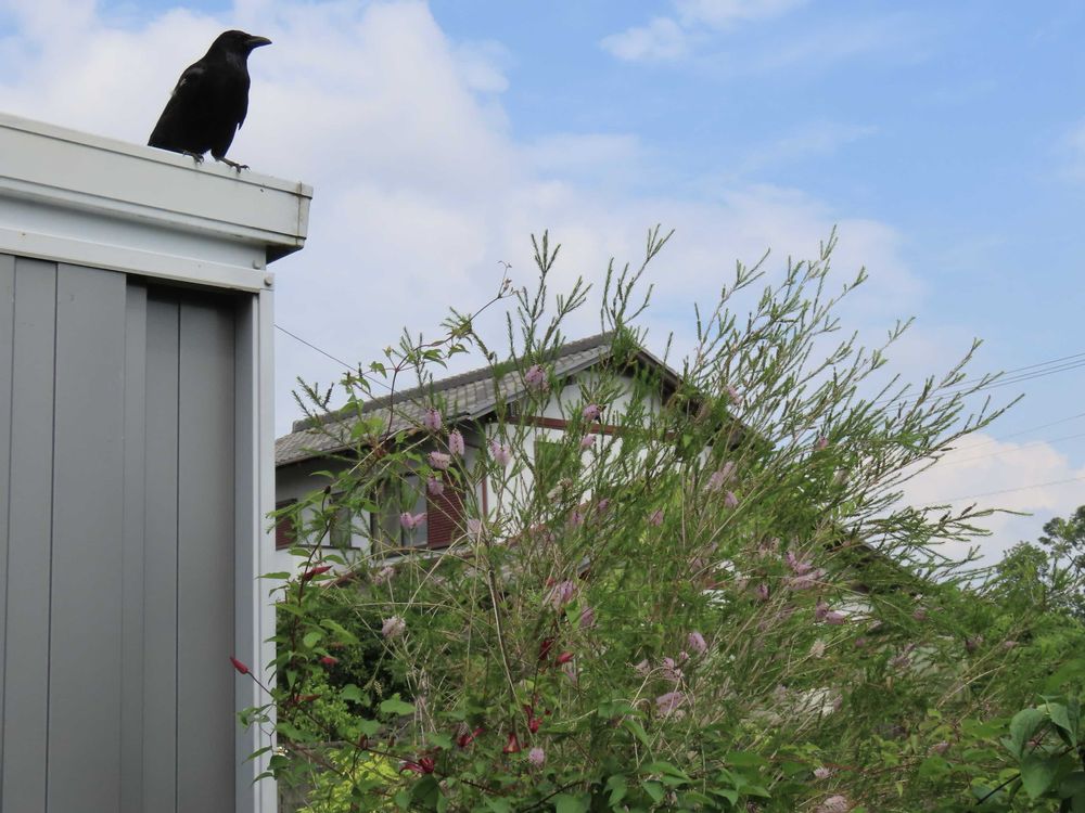 外の物置の上によく止まるのよ🐦⬛