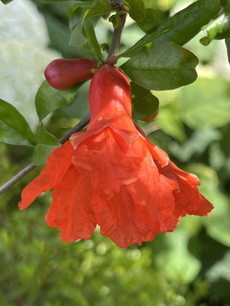 ちょっとだけタコさんウインナーみたいな赤っぽいオレンジ色の花が初夏に咲きます。秋には似た色の食用果実が成ります。