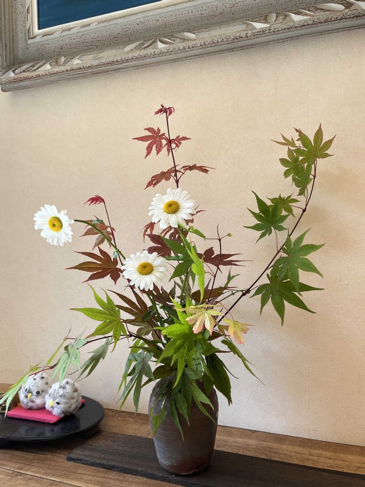 モミジの名月とヤマボウシの葉が茂って来たので剪定した枝で花遊び 玄関に