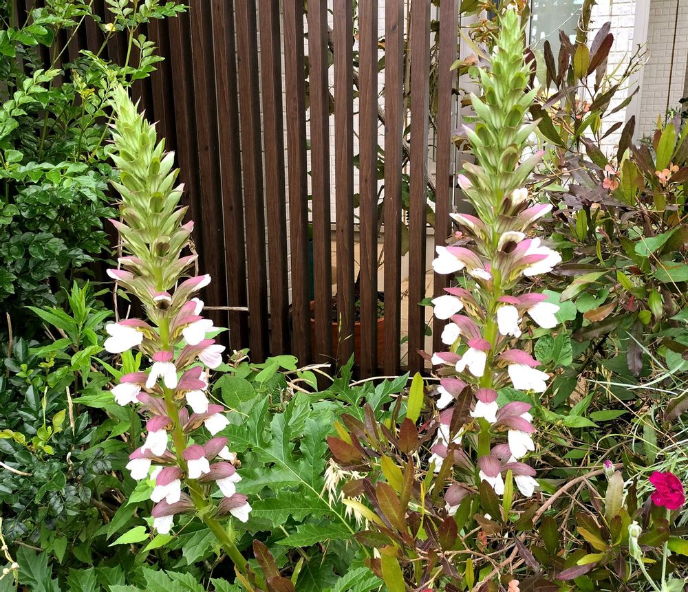 激戦?🌿をくぐり抜けて、背伸び競争を勝ち抜いてきたのは…アカンサスでした!初開花です🎵😃✨