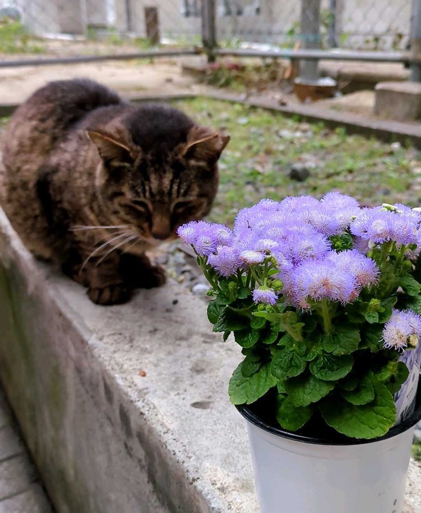 夜中にこんばんわ🌃梅雨入りして雨がしばらく続きそうです😢嫌ですね❣️アゲラタム、ジニア、ペンタス等色々なお花で賑やかになりましたね🤗地域猫のしーちゃん😻、穏やかな表情してますね😍みんなに可愛がられるのがわかります♪