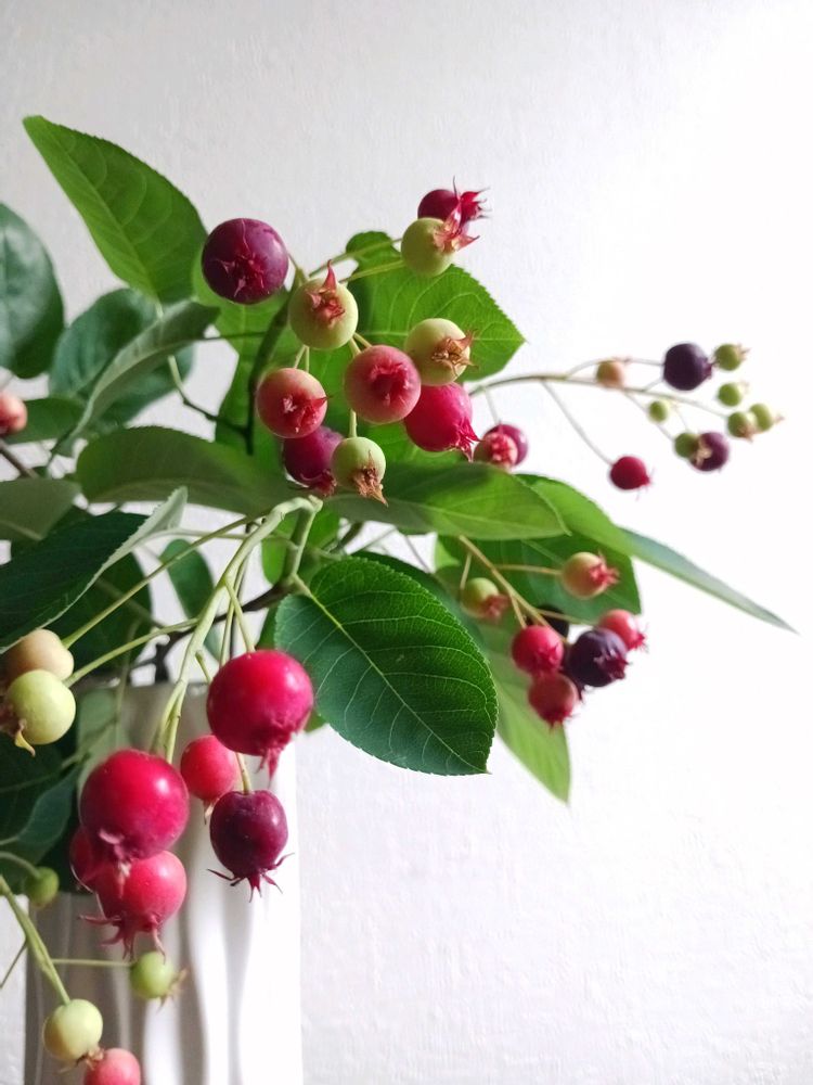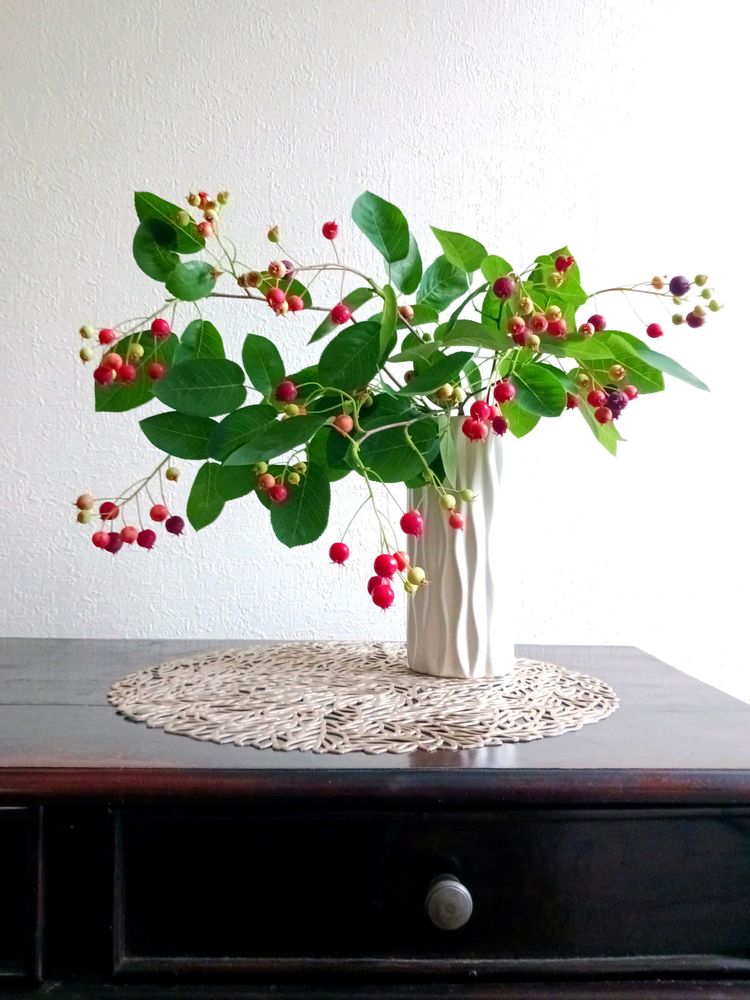ジューンベリー、年一回はこうして生けて愛でたくて、鳥さんたちには少し我慢してもらってます。昔はジャム作りとか果実酒作りに挑戦したけど種が多くて邪魔なので鑑賞だけの楽しみになりました。種は気にならないという人もいますけど、ハッピーさんはどう利用するんですか?