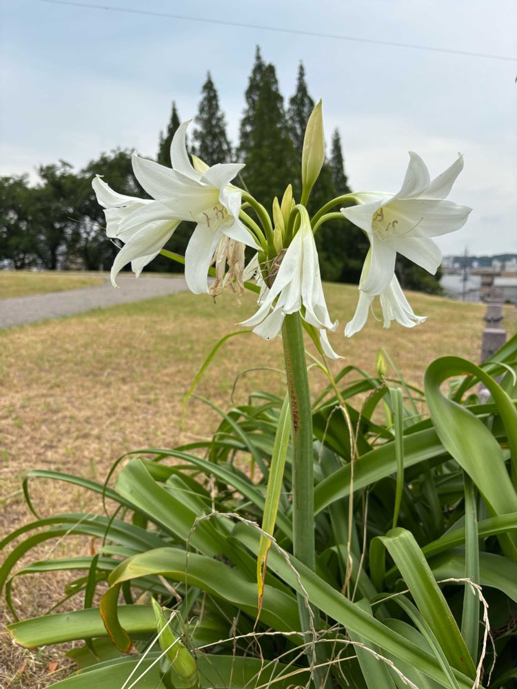 ①公園で昨日の《今日のお花》 ユリに似ている「ハマユウ」が真っ白なお花を咲かせています🤍