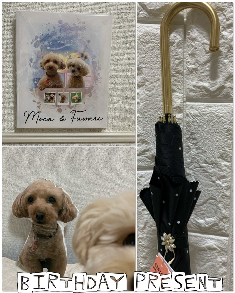 モカとふわりの写真で作ってくれたボード🖼️とキノコの様なモカクッション🤣 と日傘🌂