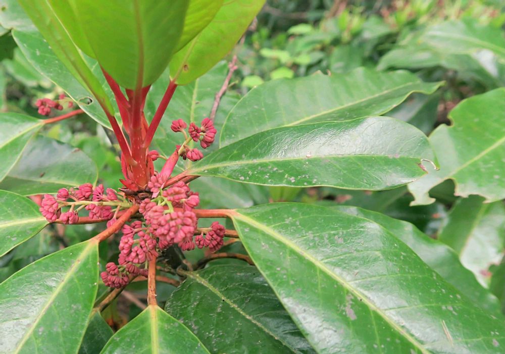 枝先に かたまってつき、葯が赤紫色をしているので、よく目立ちます。!
