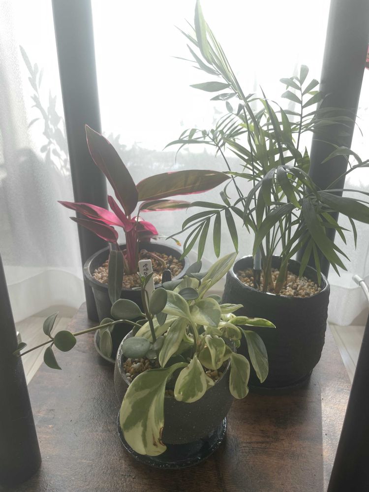 左からストロマンテ トリオスター(療養2年目)、ペペロミア(今年から)、テーブルヤシ。全て室内組。