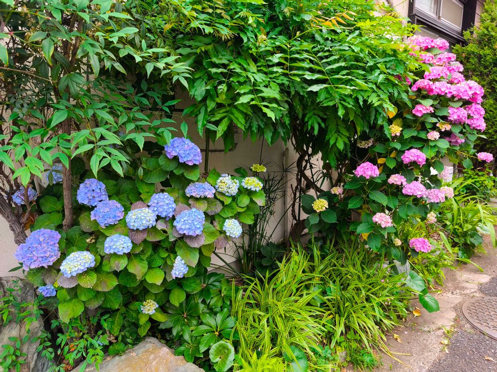 アジサイはお互いすぐ近くに植わってるのに青系とピンク系でアジサイの色が異なるのは土が酸性アルカリ性という要素だけでは決まらないということなのかしら🤔