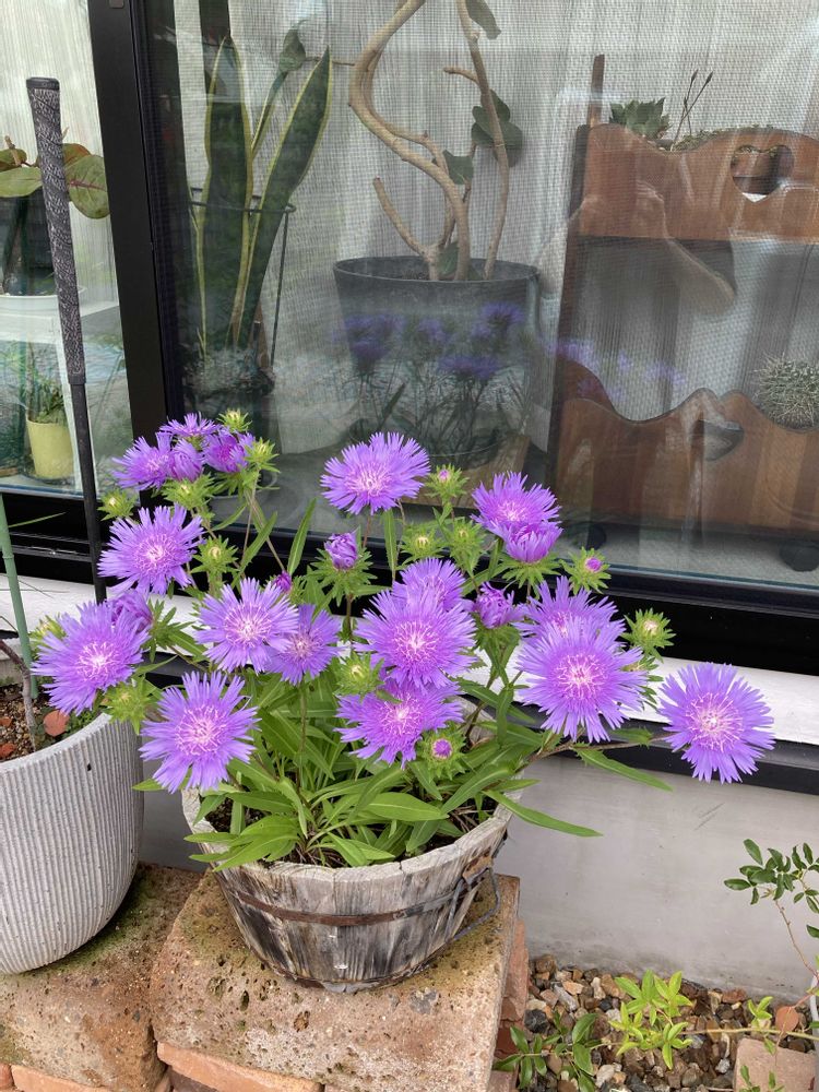 ストケシアが満開。水やりしてきてよかった。綺麗な色で大好きです。