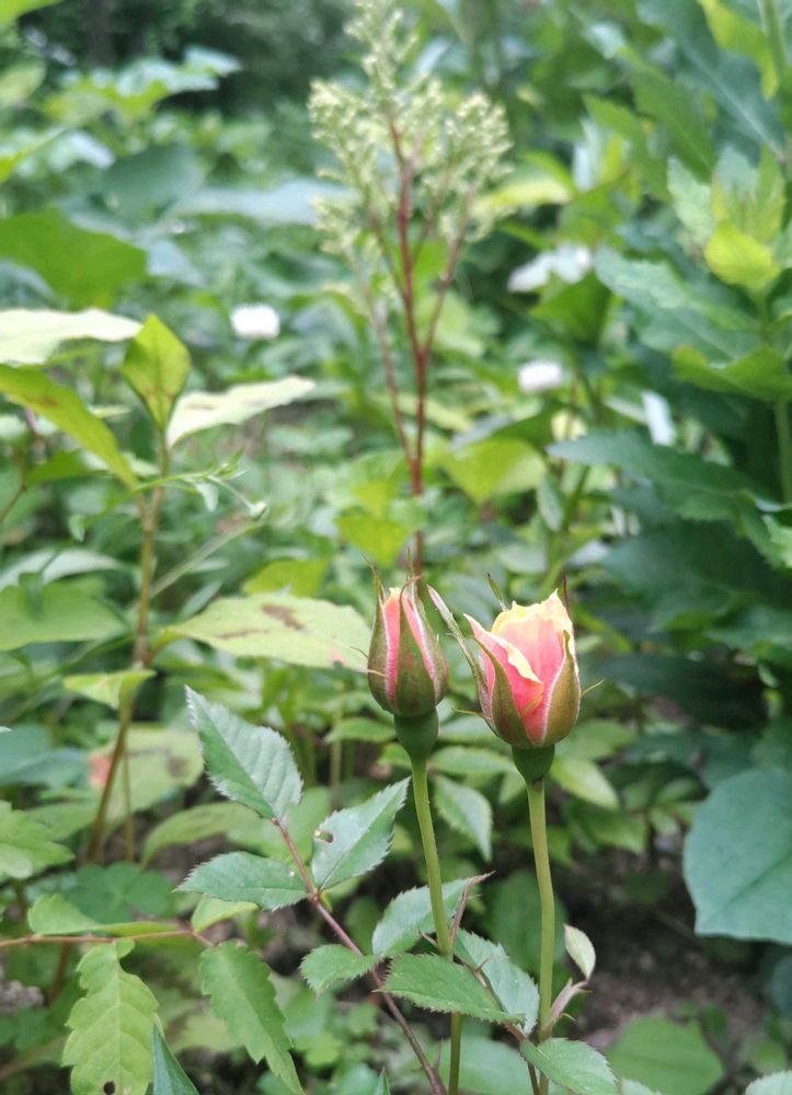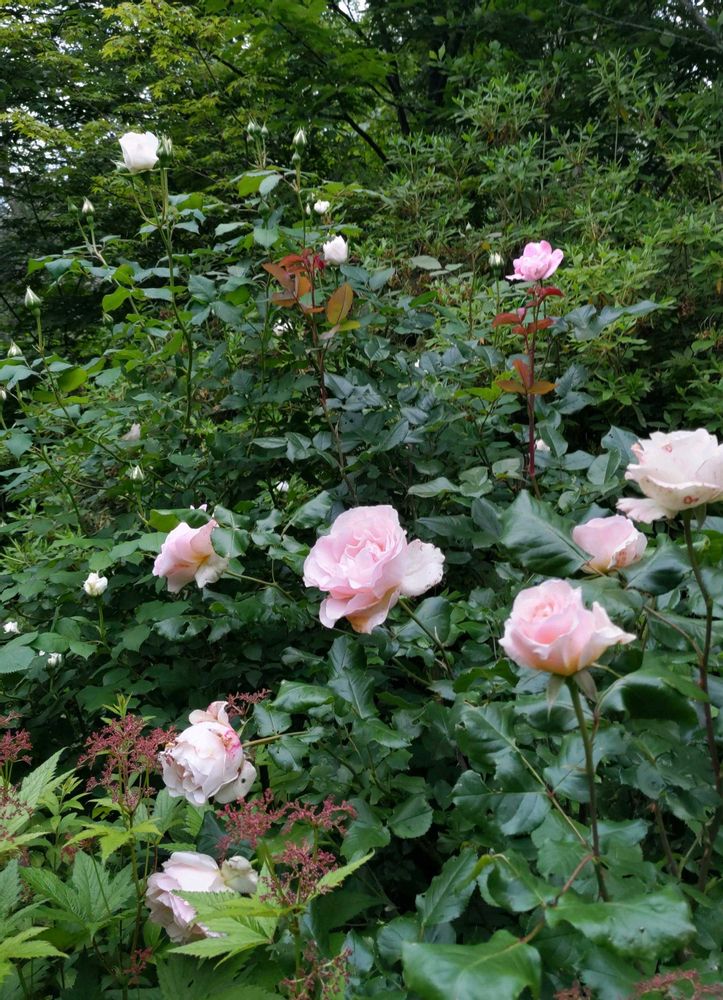 ②最初に咲いてきたのはロココ、奥のオーブ・レジェールはまだ咲き始め…標高1000m近くにある我が家のバラは梅雨と重なりちょっと可哀想。。♡♡♡