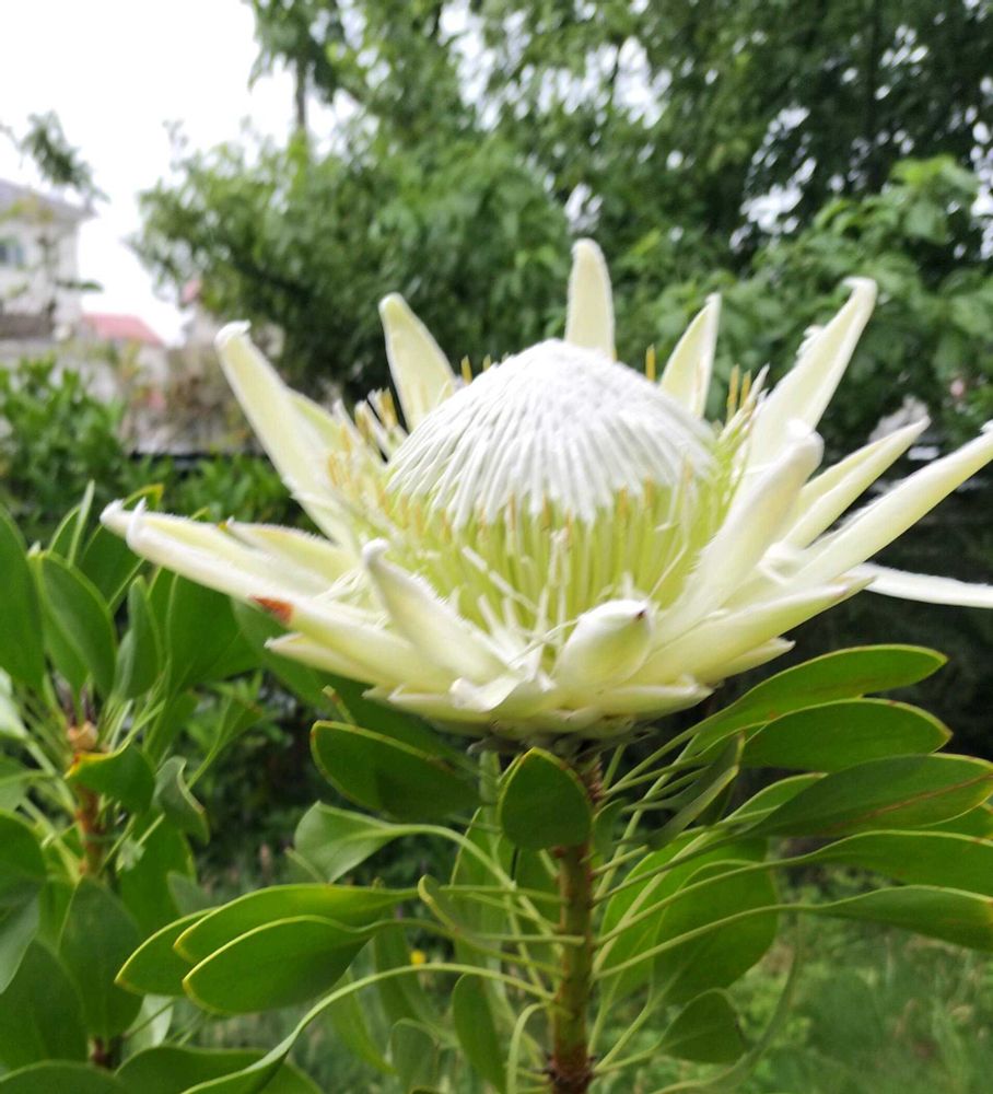 梅雨空の花壇に、純白のプロテアさんが眩しく見えます✨🤍🤍🤍✨