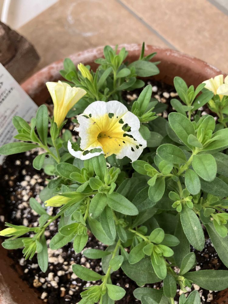 ようやく復活して咲いてくれたミリオンベルが穴だらけー😭