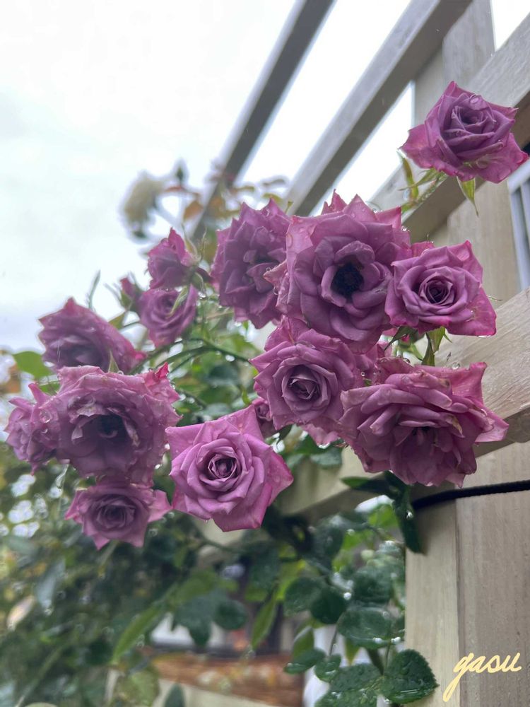 この子はミニバラなのですがとても旺盛です✨ ミニバラは数本を寄せ植えにしてあることが多いですが、育ってきたので3、4鉢に分けてそれぞれ株が育ってきました🎶 1番元気な鉢をつるバラフェンス裏の棚に置いてつるバラとコラボしたいなぁと😅 燻んだ感じのラベンダー色が魅力です🪻