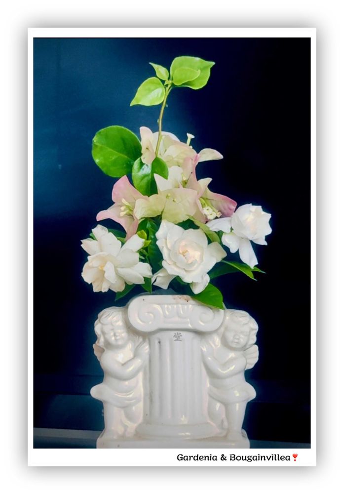 @訳意;Joyful angels with a vase of bougainvillea and gardenia flowers.