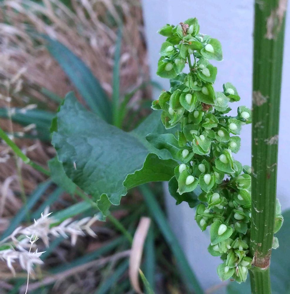 ツツジやシャリンバイの低木と野草の生え放題の植え込みに生えていたナガバギシギシ。