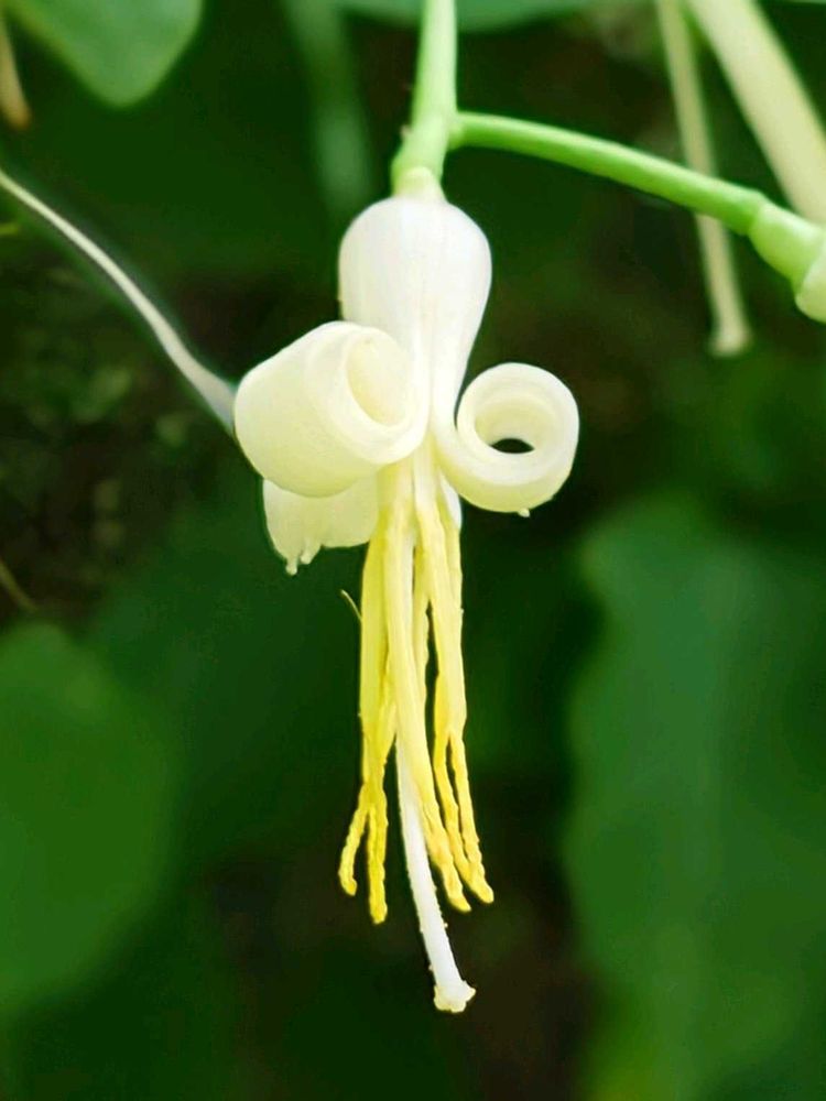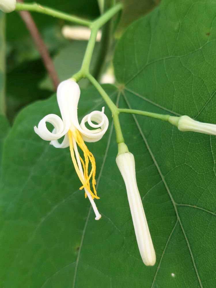 瓜の葉に似た大きな葉の下に花弁をクルクル🌀と巻いて咲いていました