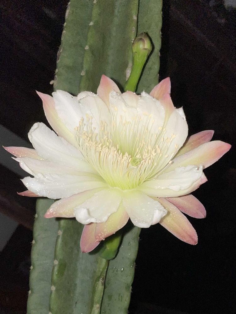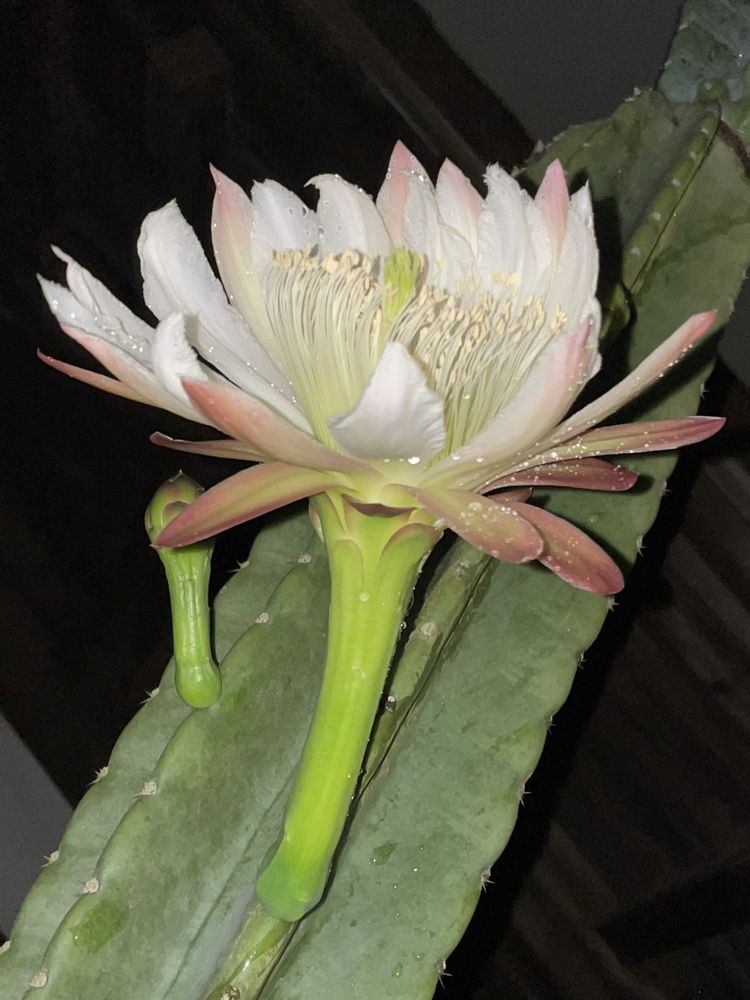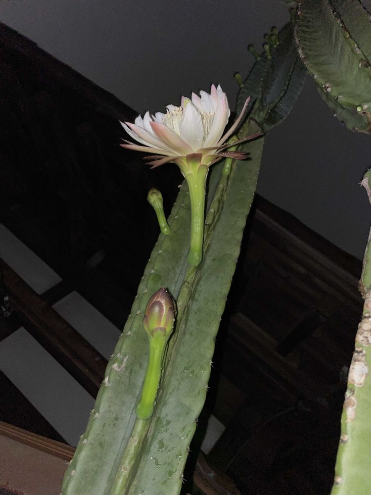 おはようございます😊まだ、このサボテンの中では下の方に咲いたので1番低い脚立で大丈夫でした。問題は雨。もう、こんな日に梅雨に入ってしまって。自分に21時が最後と言い聞かせ撮りました。咲いてくれて良かったです😊朝6時にはつぼんでいました。儚い命ですね。