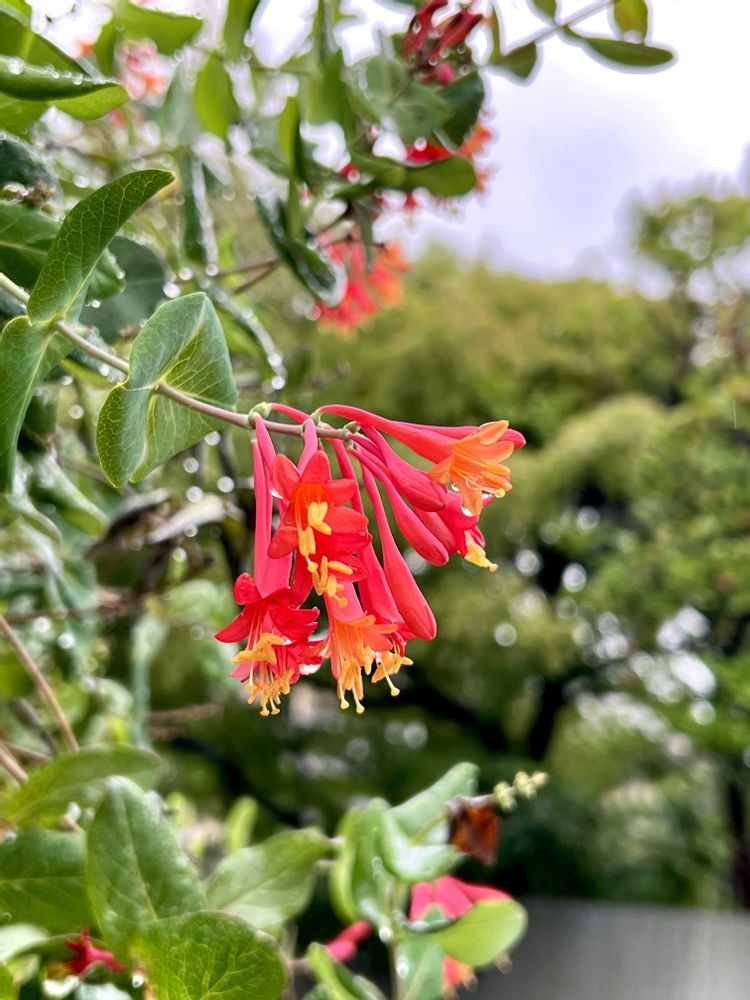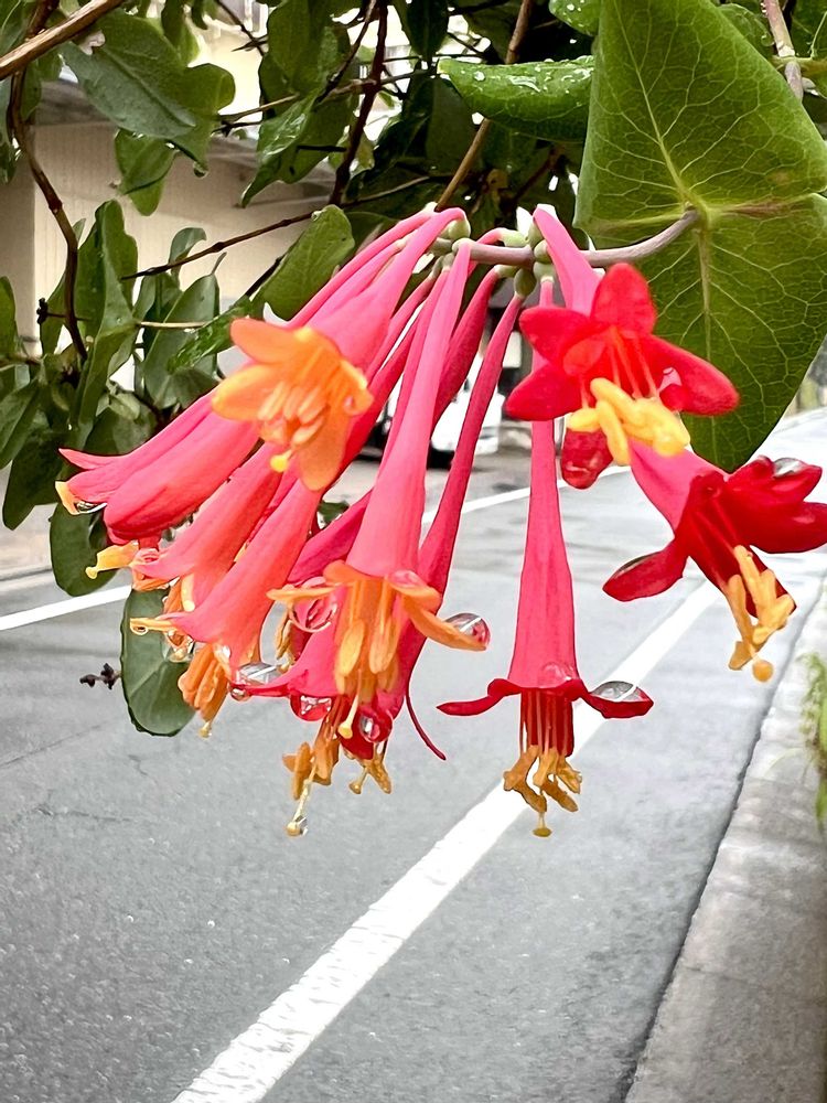 ツキヌキニンドウ、赤い花が雨の中で目立っていました。