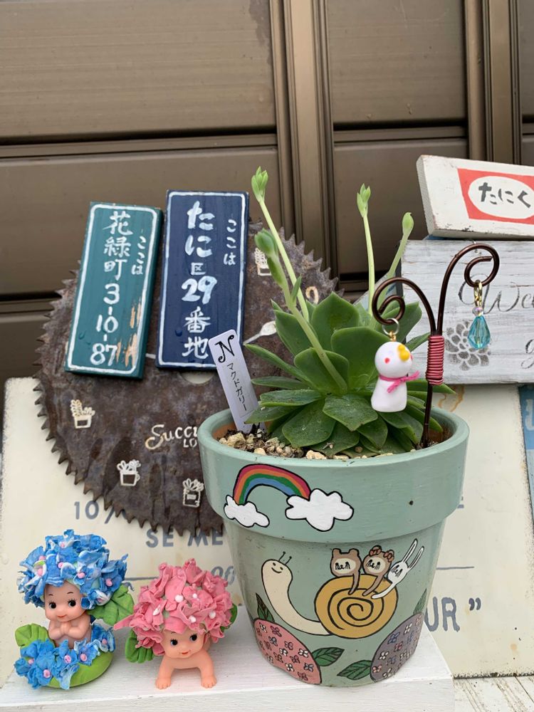 エツコさんのカタツムリ🐌と紫陽花のリメ鉢にテルテルタンと