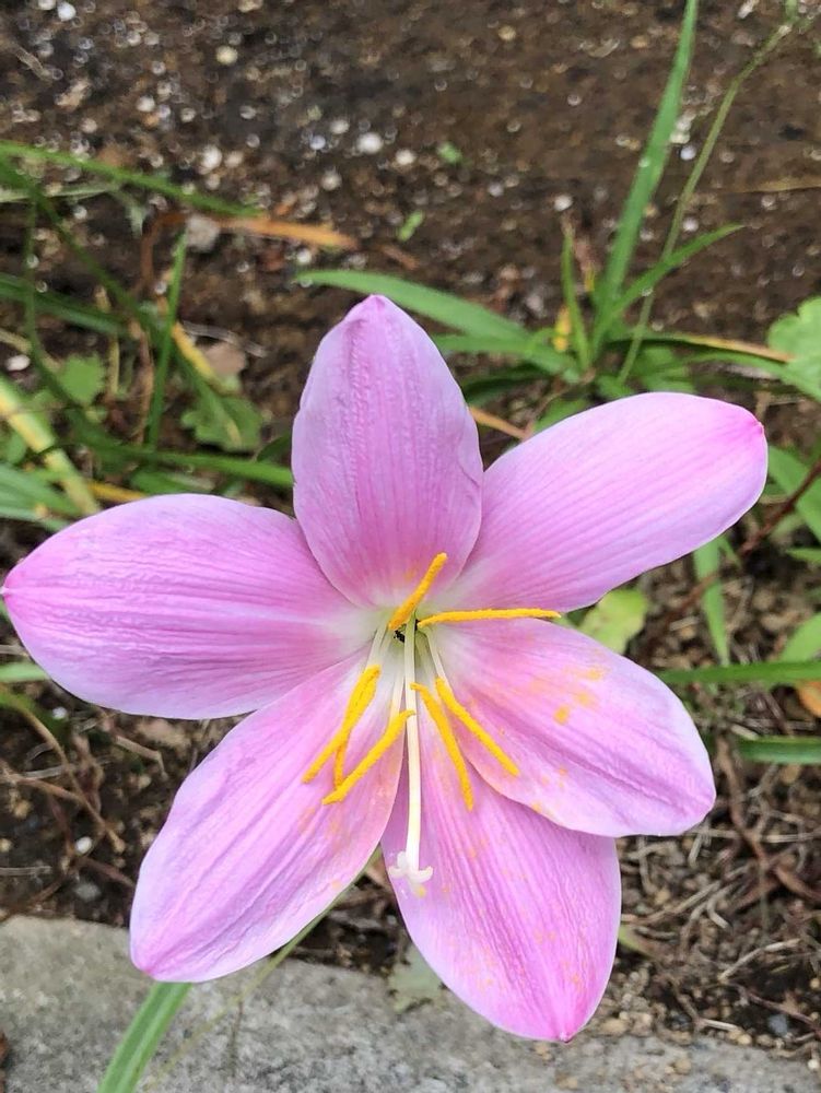 我が家の小庭、地植えしている『 レインリリー 』さんが一輪だけ帰宅したら咲いていました。